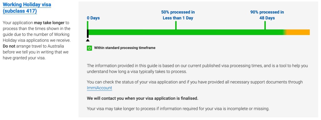 Des frais de visa s’appliquent (actuellement, le prix est de AUD $635, soit environ 390€) et le délai de traitement est amené à varier. La réponse qui arrive par e-mail, peut être immédiate mais peut également prendre quelques jours, semaines, mois,…