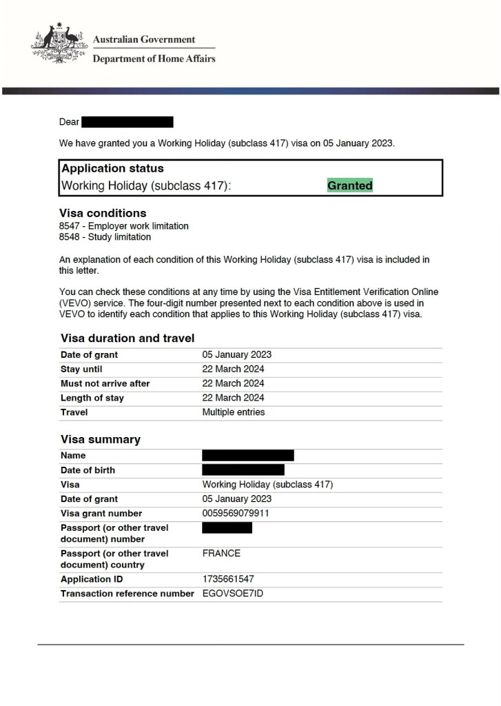 • 1er renouvellement de visa (deuxième année WHV) : Réponse réceptionnée au bout de 13 jours
